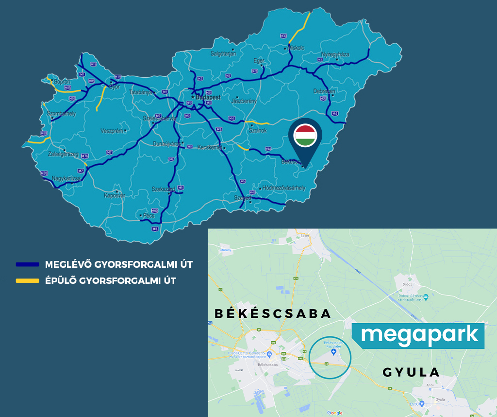Megapark kiépített infrastruktúrával rendelkezik. 3 város fókuszában Békéscsaba, Békés és Gyula között a nemzetközi kisrepülőket is fogadó békéscsabai reptér közvetlen szomszédságában helyezkedik el, amelynek nagyszabású fejlesztése jelenleg is folyik.